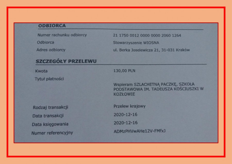 „Szlachetna Paczka”. Zebrano kwotę 130 zł, która została przekazana na konto organizatora