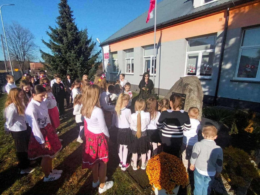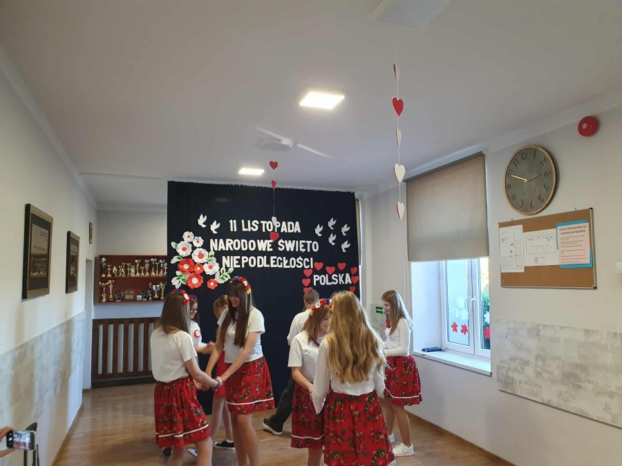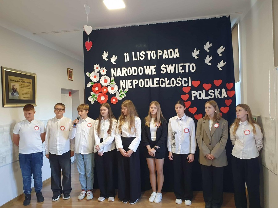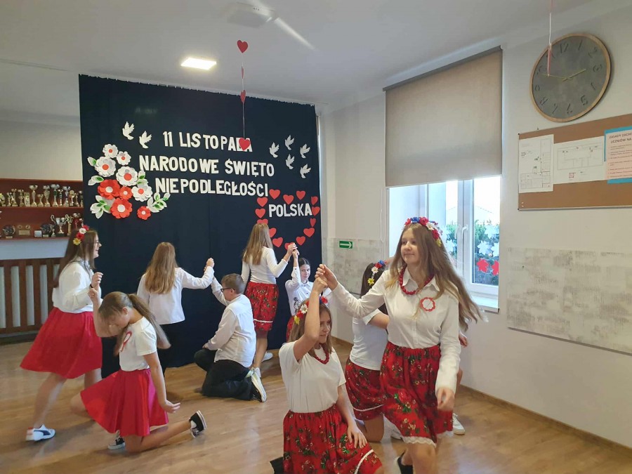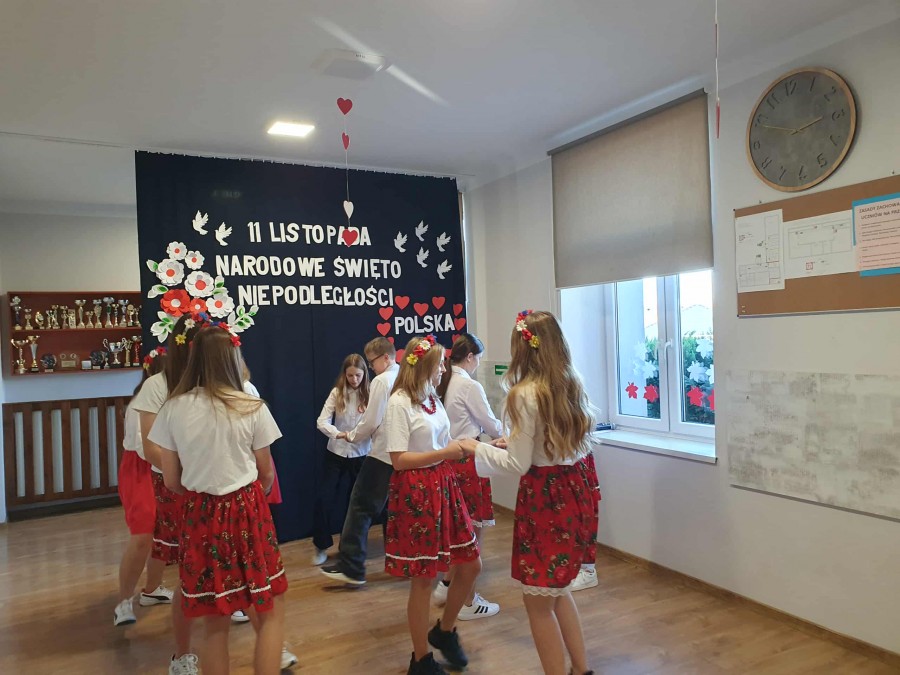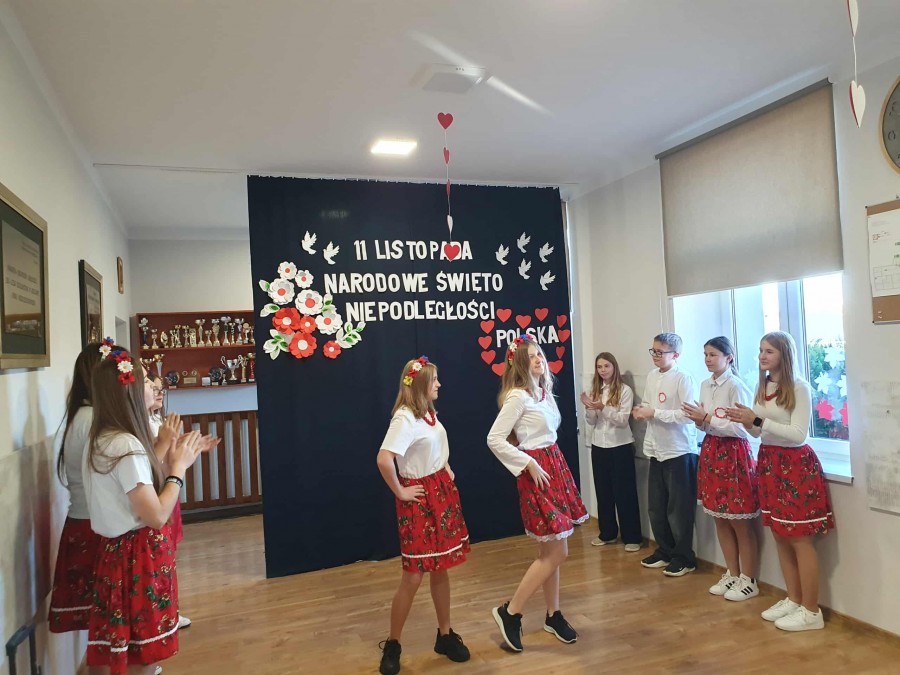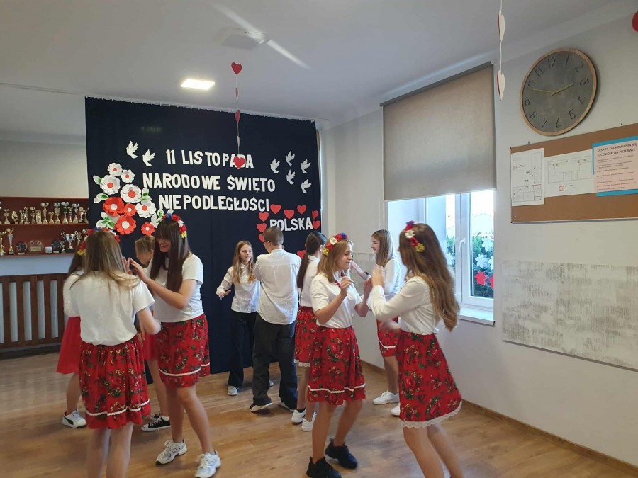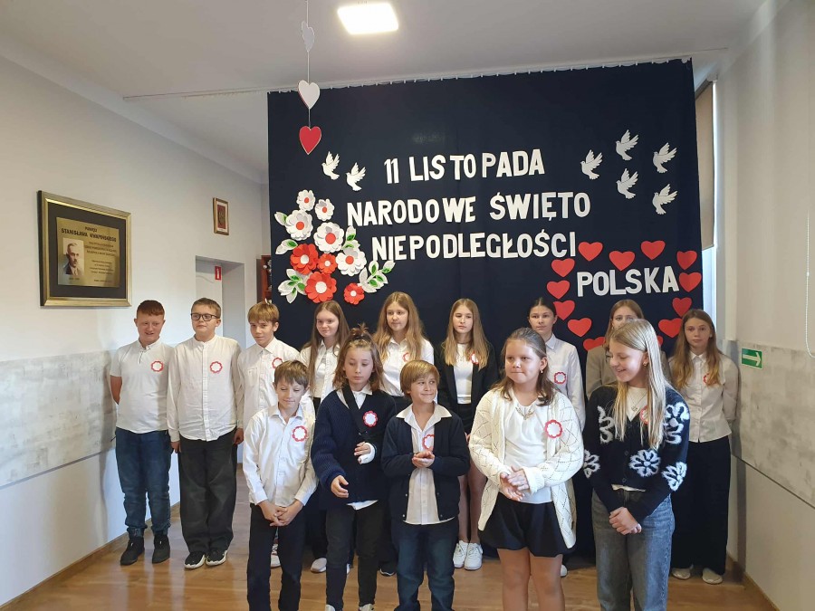 7 listopada 2025 r. w naszej szkole odbyła się uroczysta akademia. Uczniowie klasy ósmej i czwartej zaprezentowali program słowno-muzyczny poświęcony naszej Ojczyźnie i dążeniom Polaków do odzyskania upragnionej wolności. Ukazali znaczenie symboli narodowych, które są bliskie i drogie sercu każdego Polaka, a także złożyli życzenia naszej Ojczyźnie w dniu jej święta. Uczniowie klasy ósmej i siódmej zatańczyli polkę. Ich taniec wszystkim bardzo się podobał. Następnie złożyliśmy kwiaty pod obeliskiem naszego patrona Tadeusza Kościuszki.