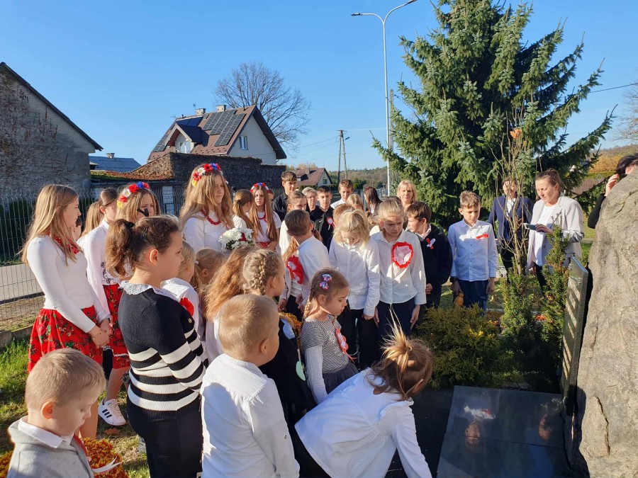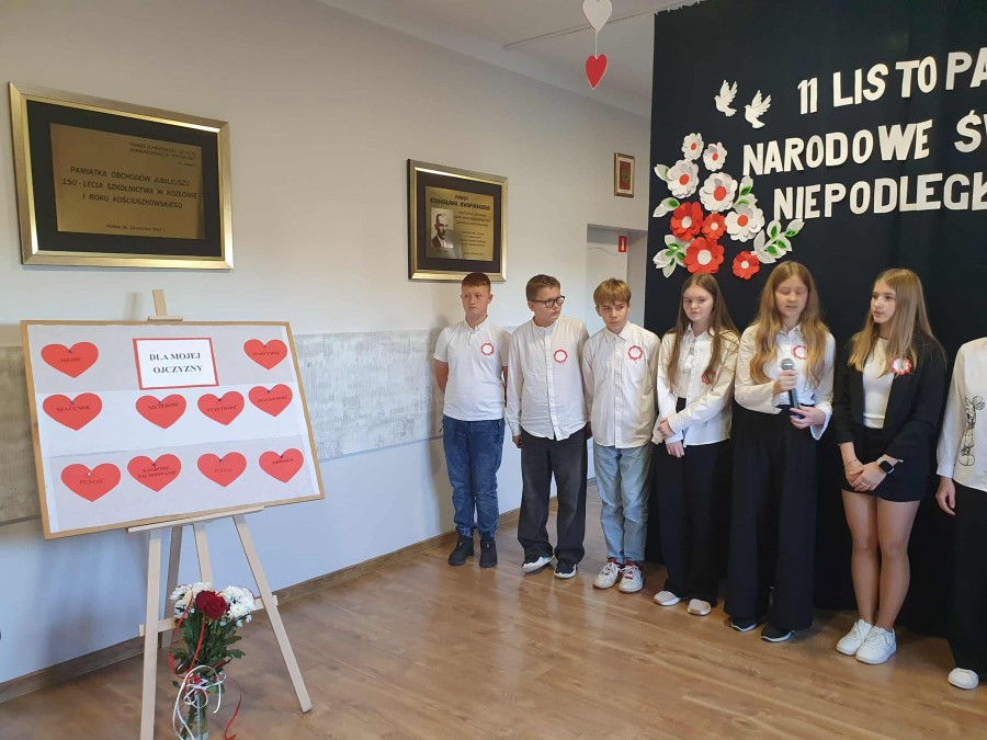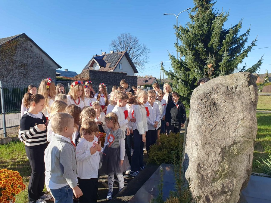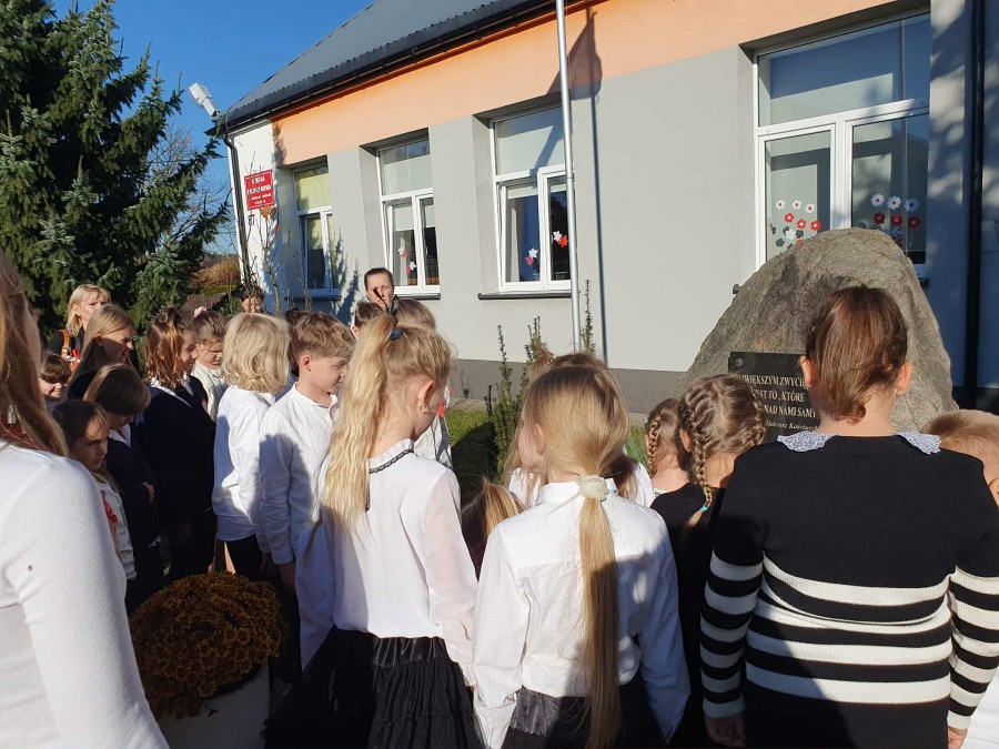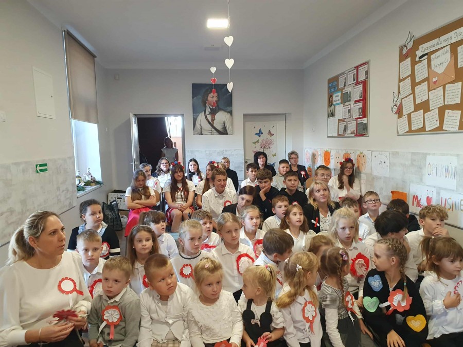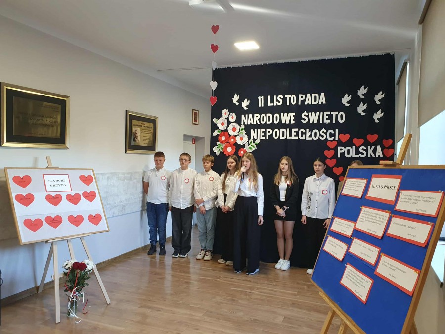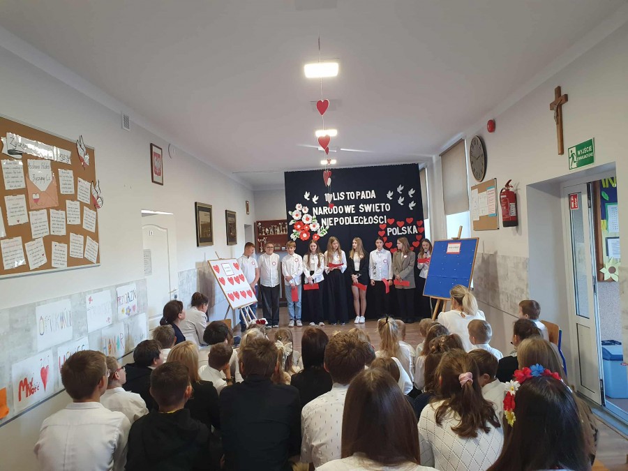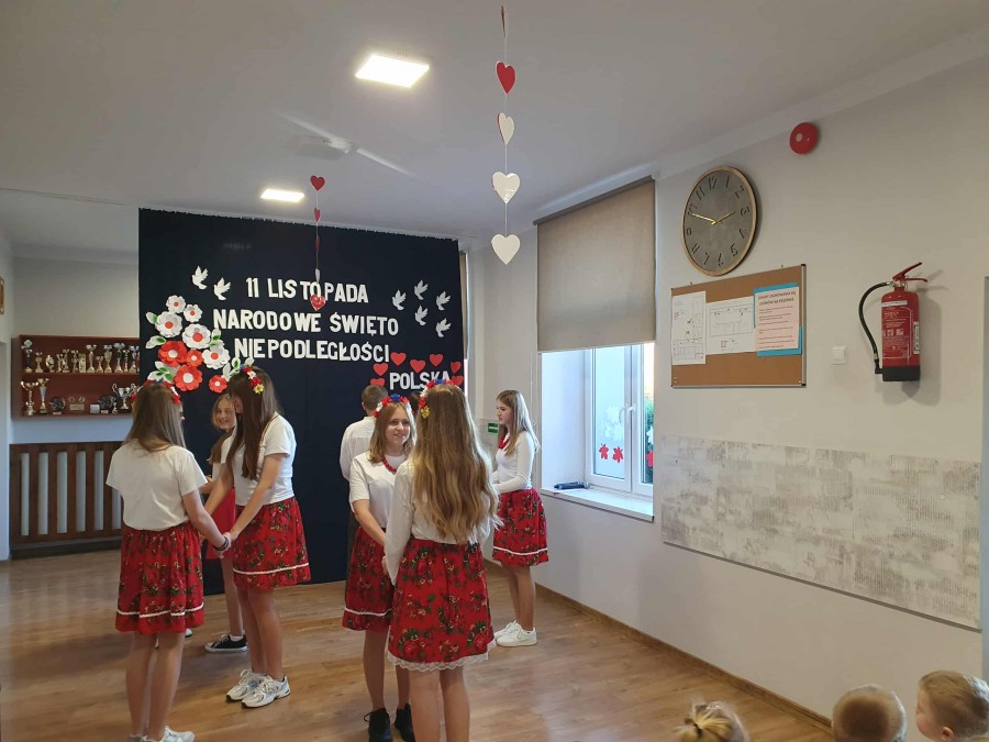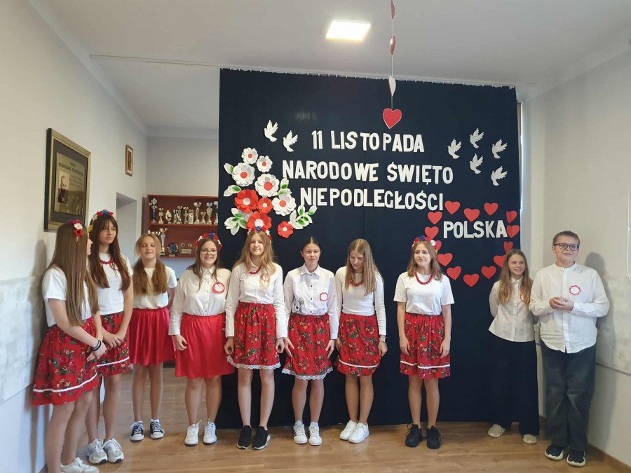 7 listopada 2025 r. w naszej szkole odbyła się uroczysta akademia. Uczniowie klasy ósmej i czwartej zaprezentowali program słowno-muzyczny poświęcony naszej Ojczyźnie i dążeniom Polaków do odzyskania upragnionej wolności. Ukazali znaczenie symboli narodowych, które są bliskie i drogie sercu każdego Polaka, a także złożyli życzenia naszej Ojczyźnie w dniu jej święta. Uczniowie klasy ósmej i siódmej zatańczyli polkę. Ich taniec wszystkim bardzo się podobał. Następnie złożyliśmy kwiaty pod obeliskiem naszego patrona Tadeusza Kościuszki.