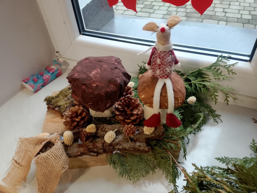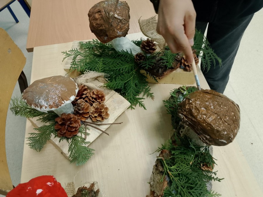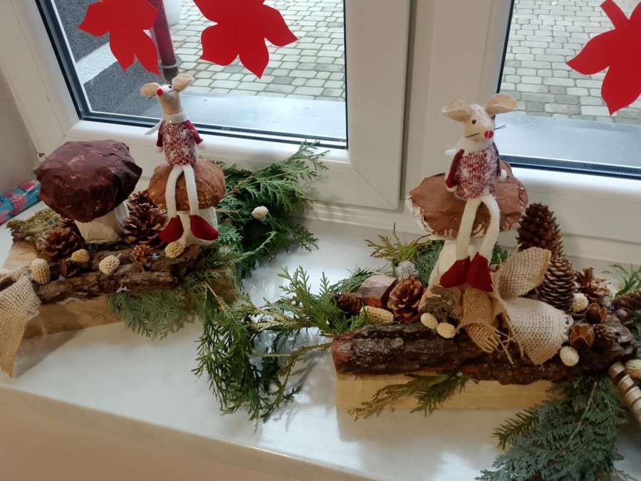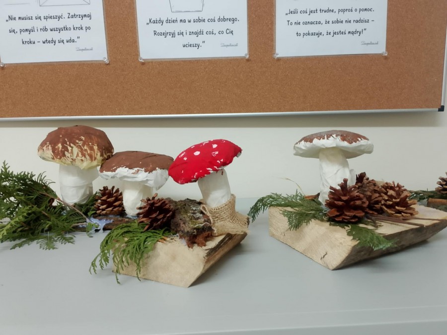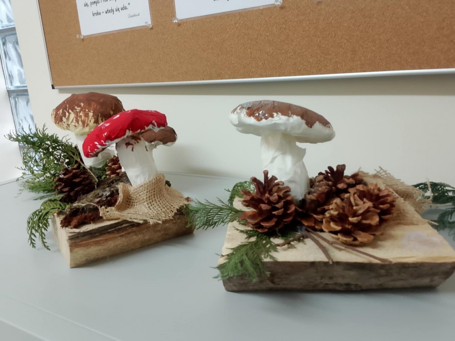 Uczniowie naszej szkoły na świetlicy szkolnej wykonali piękne jesienne stroiki. Wykorzystali do nich "dary jesieni" i grzybki zrobione z papieru. Wszystkie wyglądają pięknie zdobiąc całą szkołę.