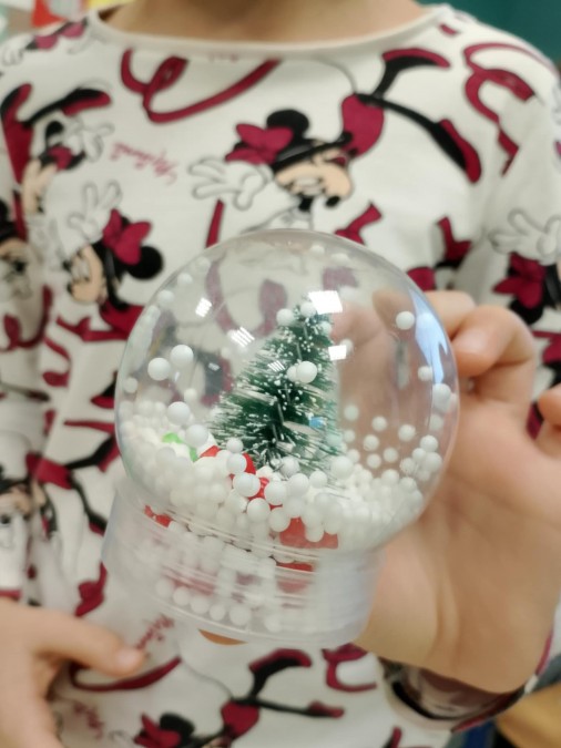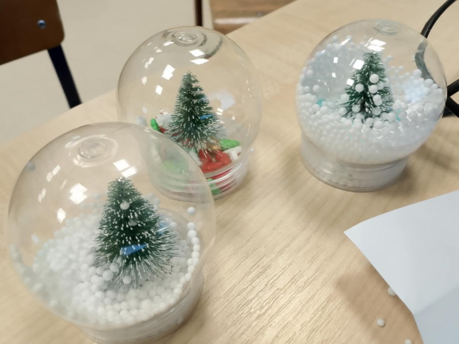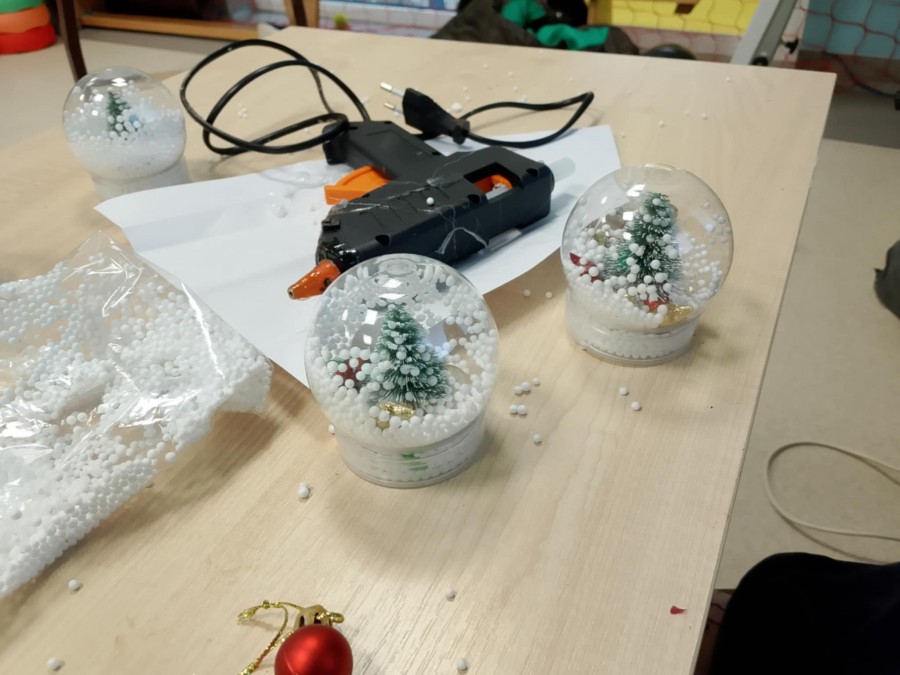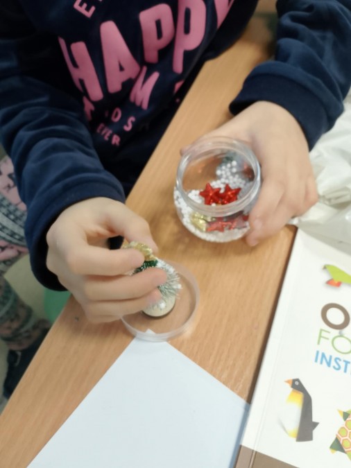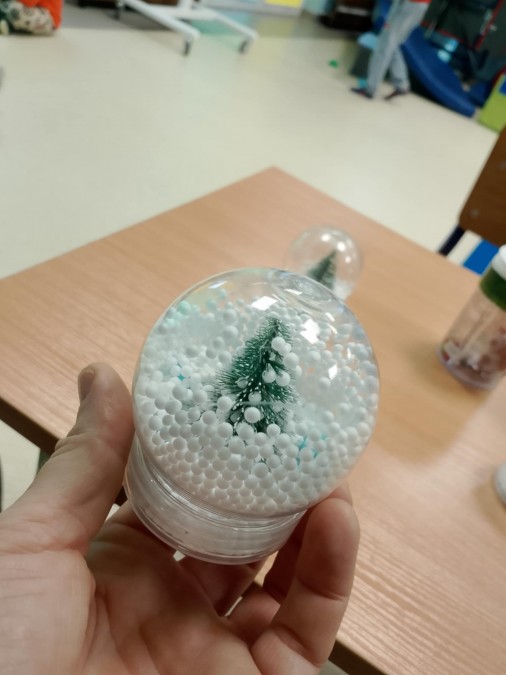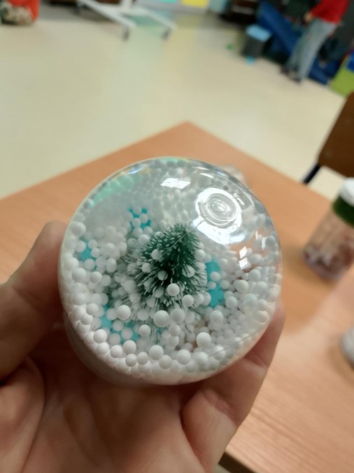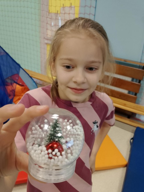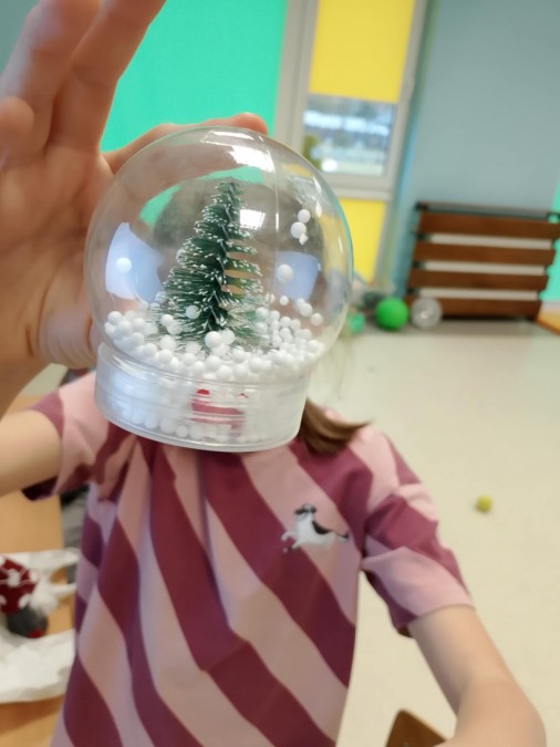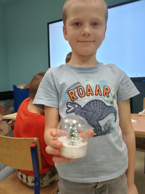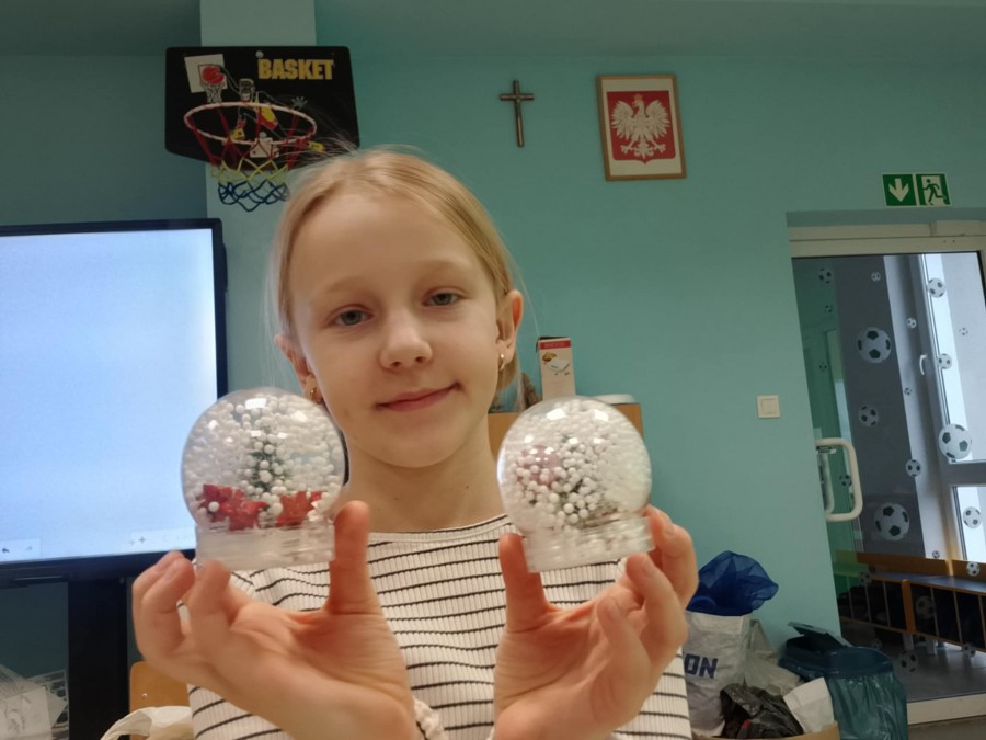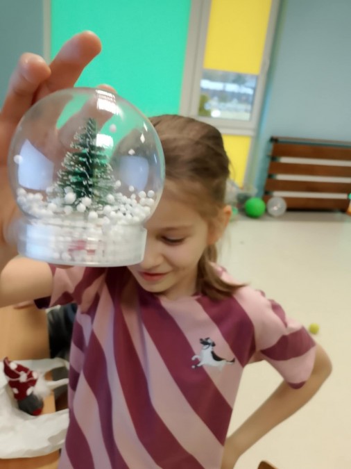 Pierwszego grudnia dzieci na świetlicy szkolnej robiły własne kule śnieżne. W ten sposób przywołujemy zimę, której nie widać na zewnątrz. Dziękujemy mamie Amelki z klasy trzeciej, która zaopatrzyła świetlicę w piękne, świąteczne dekoracje.