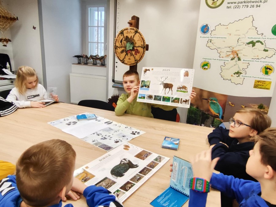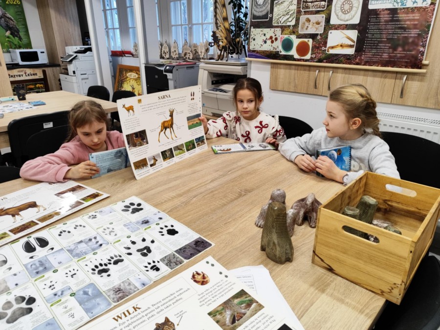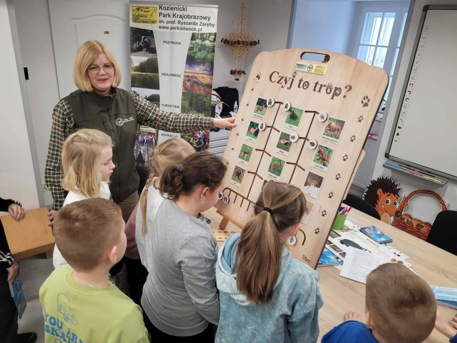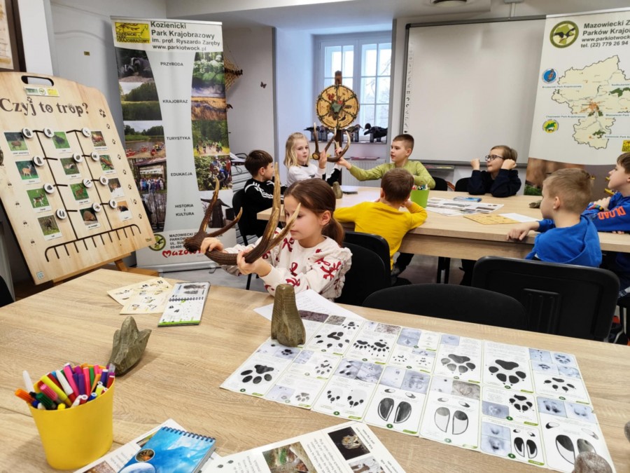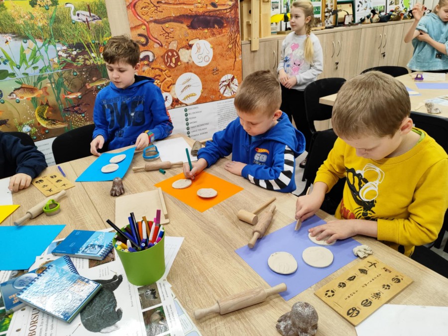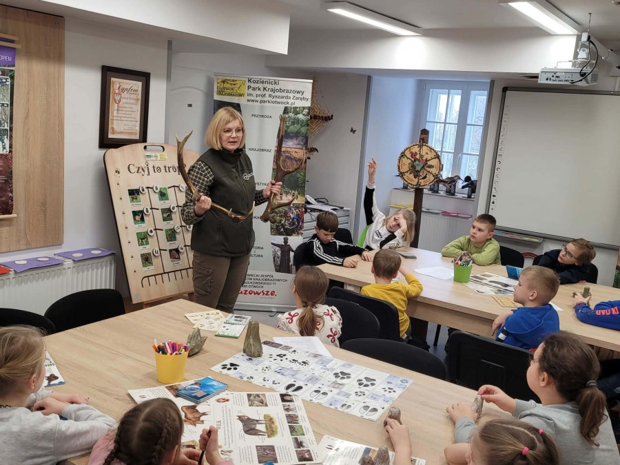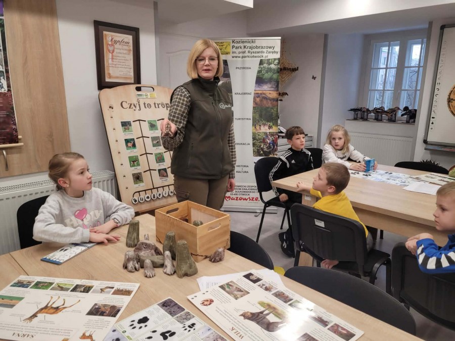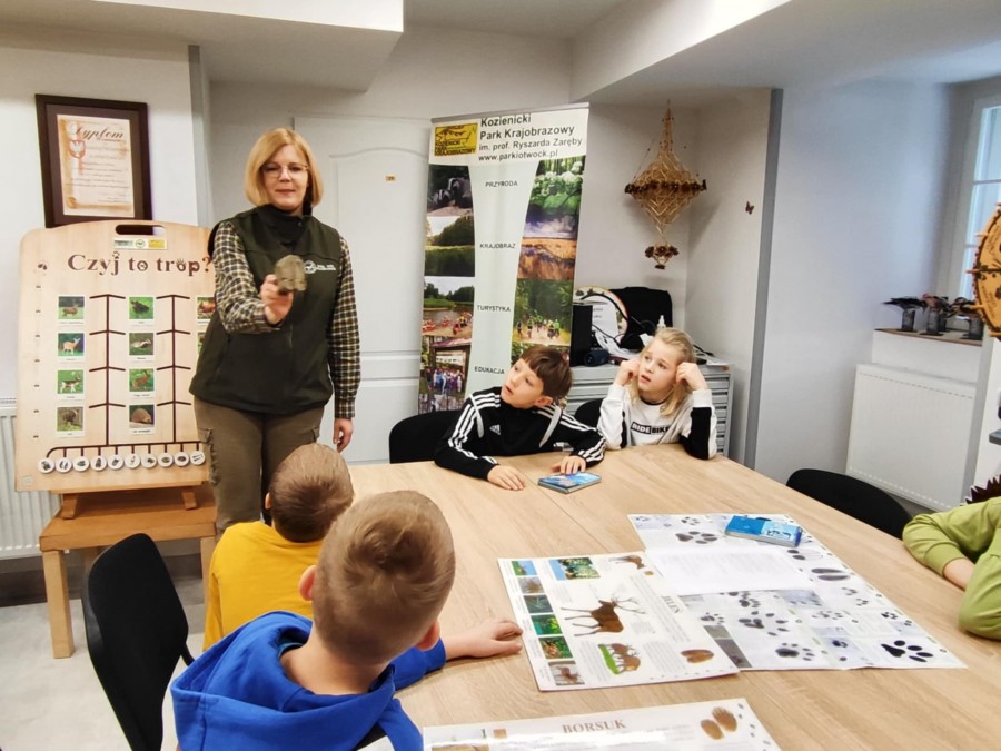Dzisiaj uczniowie klas I-IV uczestniczyli w zajęciach przyrodniczych w siedzibie Kozienickiego Parku Krajobrazowego w Pionkach. Warsztaty odbyły się pod hasłem „Na tropie leśnych zwierząt” i dostarczyły dzieciom wielu ciekawych doświadczeń oraz praktycznych aktywności. Podczas zajęć uczniowie przypomnieli sobie, czym są tropy zwierząt oraz uczyli się rozpoznawać ślady leśnych mieszkańców. Każdy miał okazję odbić tropy w glinie i zabrać swoją pracę do domu jako pamiątkę. Dzieci poznały także inne ślady obecności zwierząt w lesie, m.in. poroże jelenia czy drewno obgryzione przez bobra. Prowadząca wyjaśniła, że śladami mogą być również dziuple, ślady rycia (np. dzika), pióra oraz odchody. Uczniowie rozpoznawali zwierzęta po odgłosach, a także pracowali w grupach, układając rozsypanki zdań dotyczące omawianych gatunków. Na zakończenie każdy otrzymał kartę obserwacji śladów zwierząt do samodzielnych badań terenowych oraz piękny piórnik. To była bardzo ciekawa i angażująca lekcja przyrody.