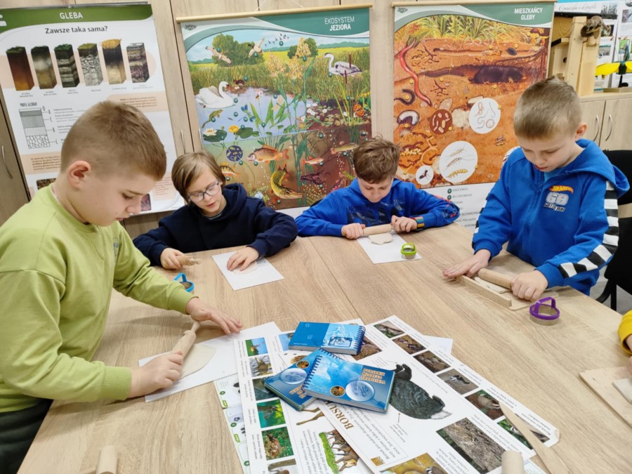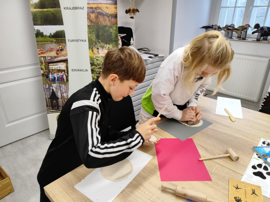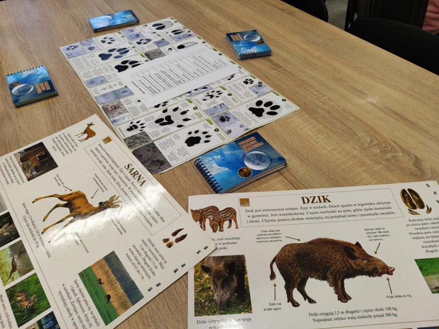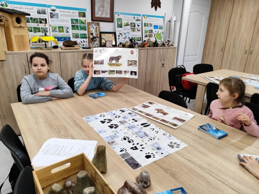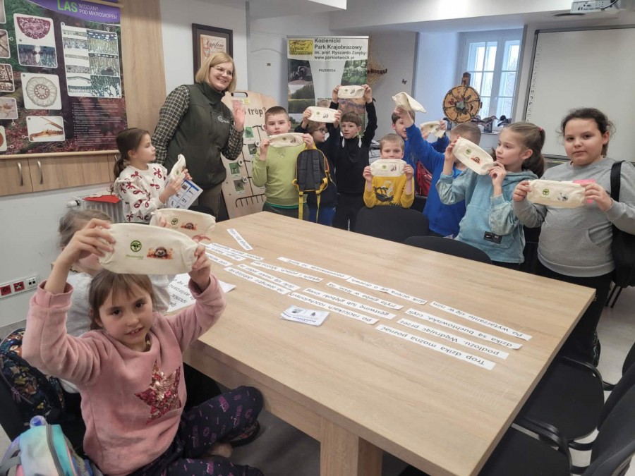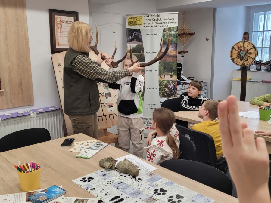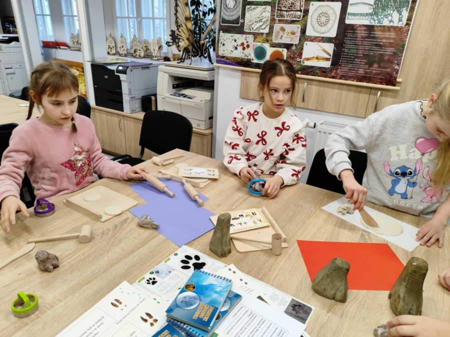 Dzisiaj uczniowie klas I-IV uczestniczyli w zajęciach przyrodniczych w siedzibie Kozienickiego Parku Krajobrazowego w Pionkach. Warsztaty odbyły się pod hasłem „Na tropie leśnych zwierząt” i dostarczyły dzieciom wielu ciekawych doświadczeń oraz praktycznych aktywności. Podczas zajęć uczniowie przypomnieli sobie, czym są tropy zwierząt oraz uczyli się rozpoznawać ślady leśnych mieszkańców. Każdy miał okazję odbić tropy w glinie i zabrać swoją pracę do domu jako pamiątkę. Dzieci poznały także inne ślady obecności zwierząt w lesie, m.in. poroże jelenia czy drewno obgryzione przez bobra. Prowadząca wyjaśniła, że śladami mogą być również dziuple, ślady rycia (np. dzika), pióra oraz odchody. Uczniowie rozpoznawali zwierzęta po odgłosach, a także pracowali w grupach, układając rozsypanki zdań dotyczące omawianych gatunków. Na zakończenie każdy otrzymał kartę obserwacji śladów zwierząt do samodzielnych badań terenowych oraz piękny piórnik. To była bardzo ciekawa i angażująca lekcja przyrody.