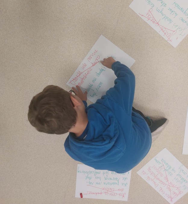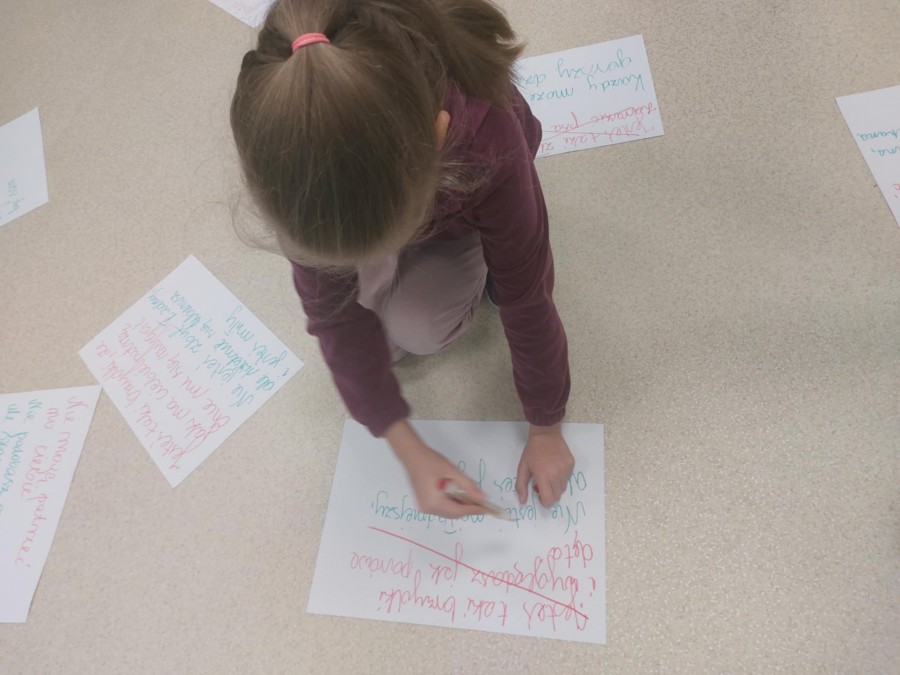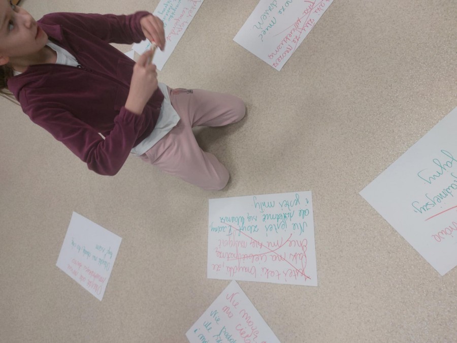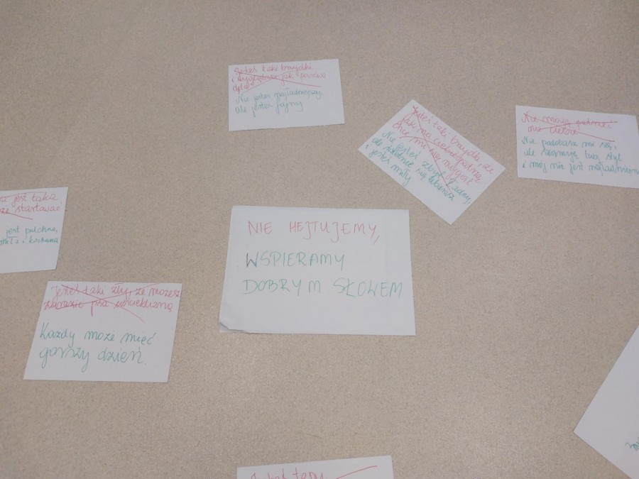 W naszej szkole cały czas pracujemy nad komunikacją, dbamy, by w wypowiedziach naszych uczniów było jak najmniej (albo wcale) tekstów hejterskich. Chcemy je zastępować dobrym słowem. Podczas zajęć uczyliśmy się przekształcać komunikaty obraźliwe na takie, które mają pozytywny przekaz. Wszyscy zgodnie stwierdziliśmy, że w świecie życzliwych i miłych słów żyje nam się o wiele lepiej.