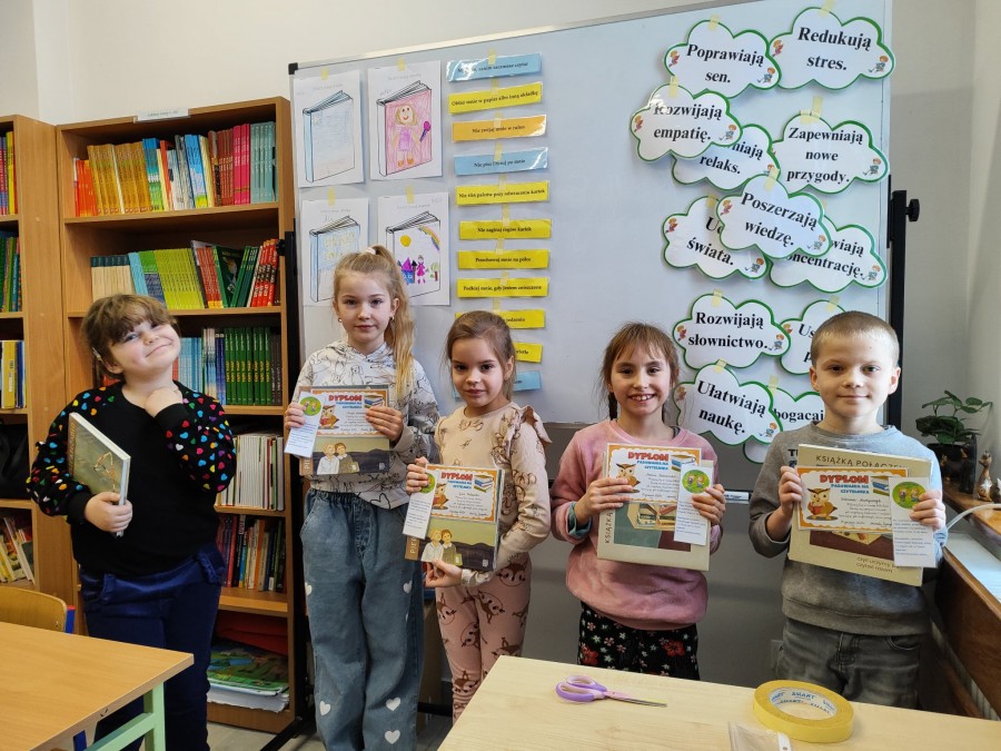 Dzisiaj w naszej szkole odbyło się uroczyste pasowanie na czytelnika uczniów klasy pierwszej. Uroczystość przeprowadziła pani bibliotekarka, która przybliżyła dzieciom, czym jest biblioteka, jakie zasady w niej obowiązują oraz jak należy dbać o książki. Na pierwszoklasistów czekały liczne próby i zadania, które musieli wykonać, aby zostać prawdziwymi czytelnikami biblioteki szkolnej. Uczniowie wykazali się kreatywnością, tworząc i projektując okładkę książki, którą chcieliby przeczytać. Kulminacyjnym momentem wydarzenia było uroczyste przyrzeczenie czytelnicze oraz wręczenie pamiątkowych dyplomów. Na zakończenie każdy uczeń otrzymał zakładkę do książki oraz książkę na dobry początek czytelniczej przygody. Serdecznie gratulujemy wszystkim nowym czytelnikom i życzymy wielu wspaniałych chwil z książką!