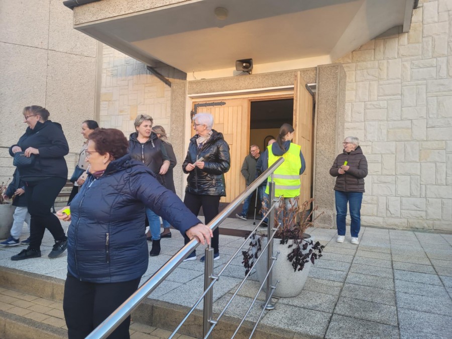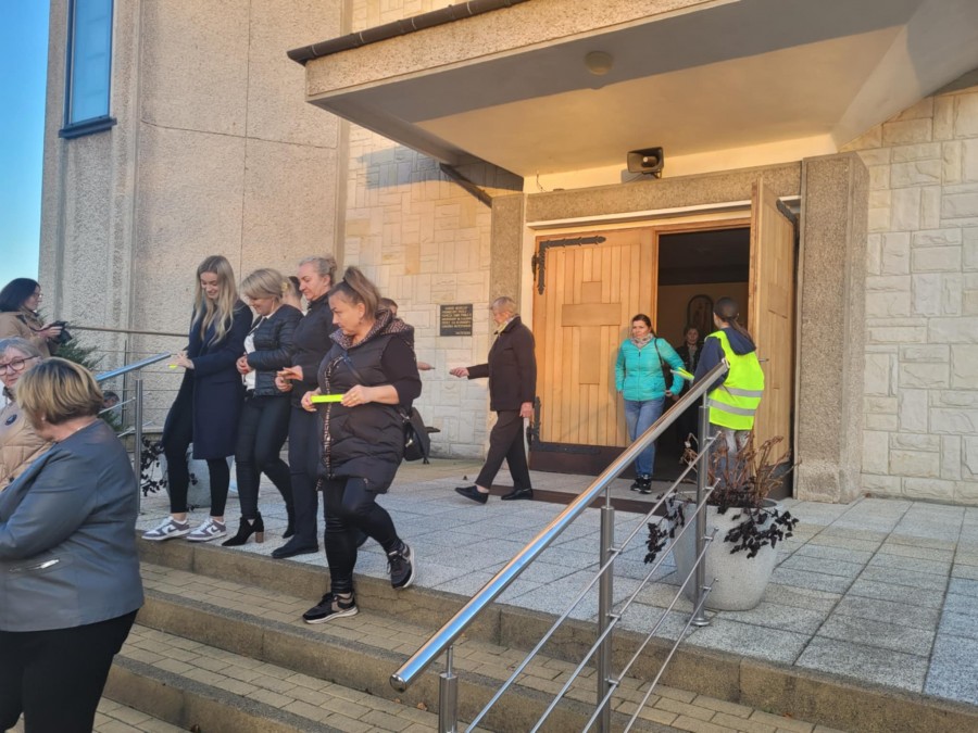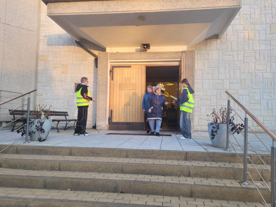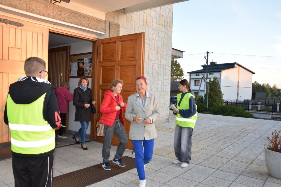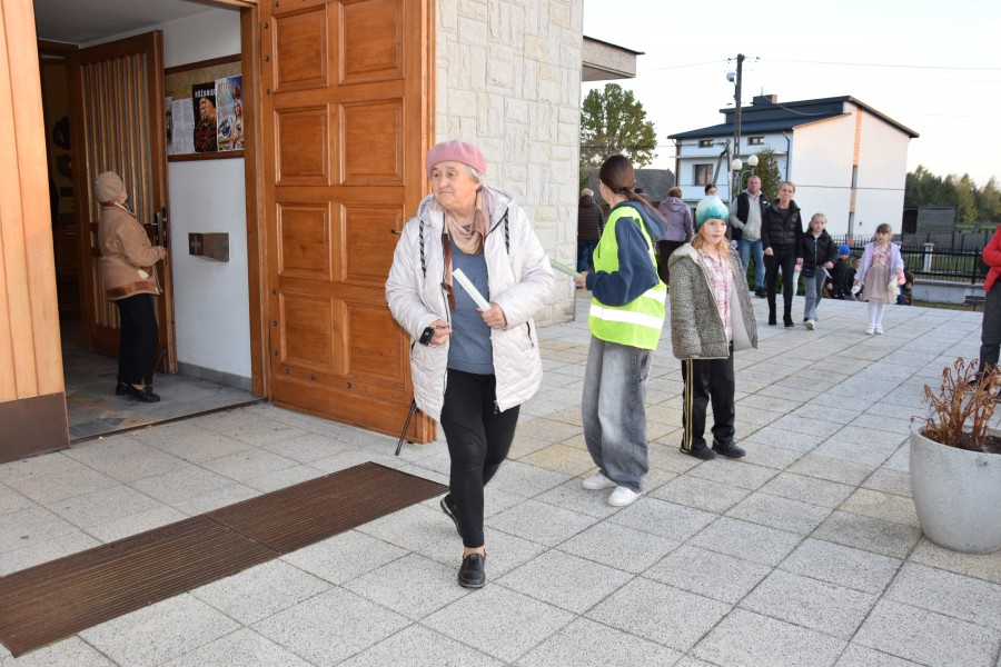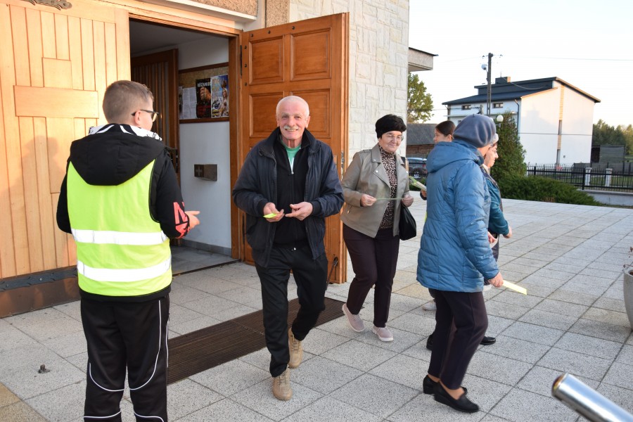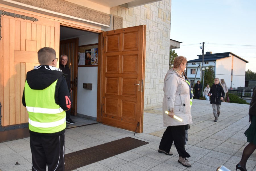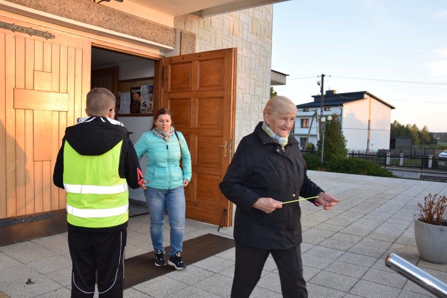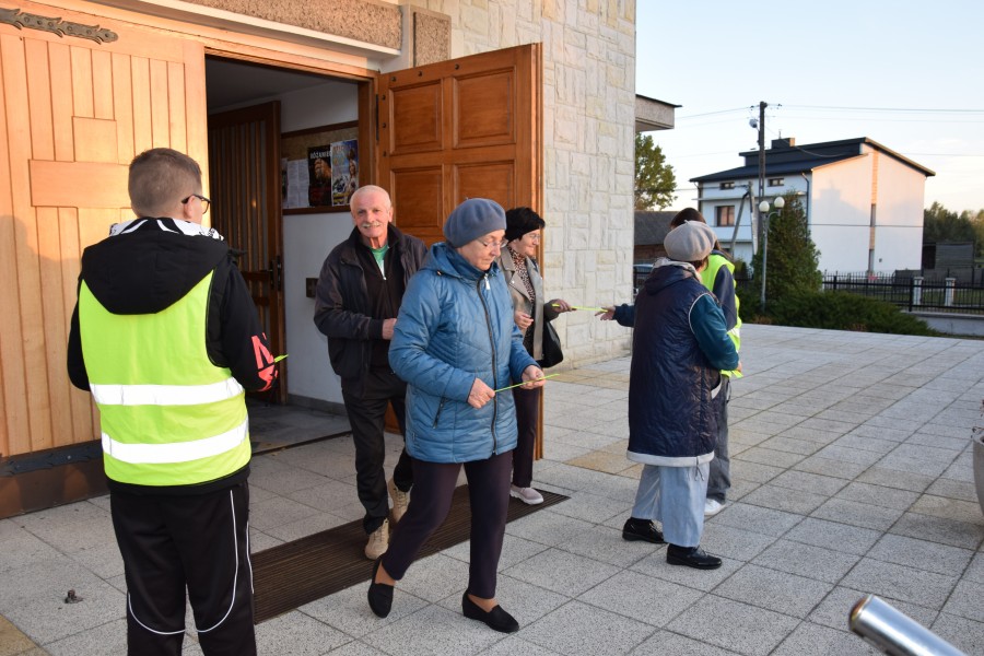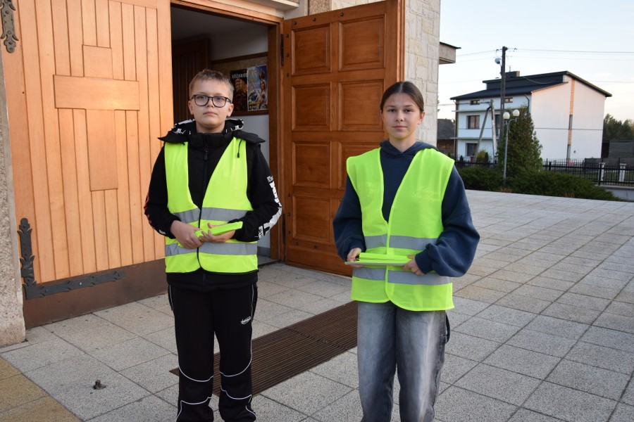 Nasi uczniowie korzystają z kamizelek odblaskowych przy każdej okazji, dlatego tym razem skierowaliśmy swoje działania ku seniorom. Pod hasłem: „Pora na odblask dla seniora” przeprowadziliśmy akcję wręczania opasek odblaskowych osobom starszym, wychodzącym z nabożeństwa różańcowego w kościele w Jastrzębi. Było to możliwe dzięki życzliwości księdza Proboszcza Grzegorza Stańczaka i zaangażowaniu księdza Damiana Sadzy. Rozdaliśmy ponad 50 odblasków, które można przyczepić do torebki, założyć na rękę czy na kierownicę roweru