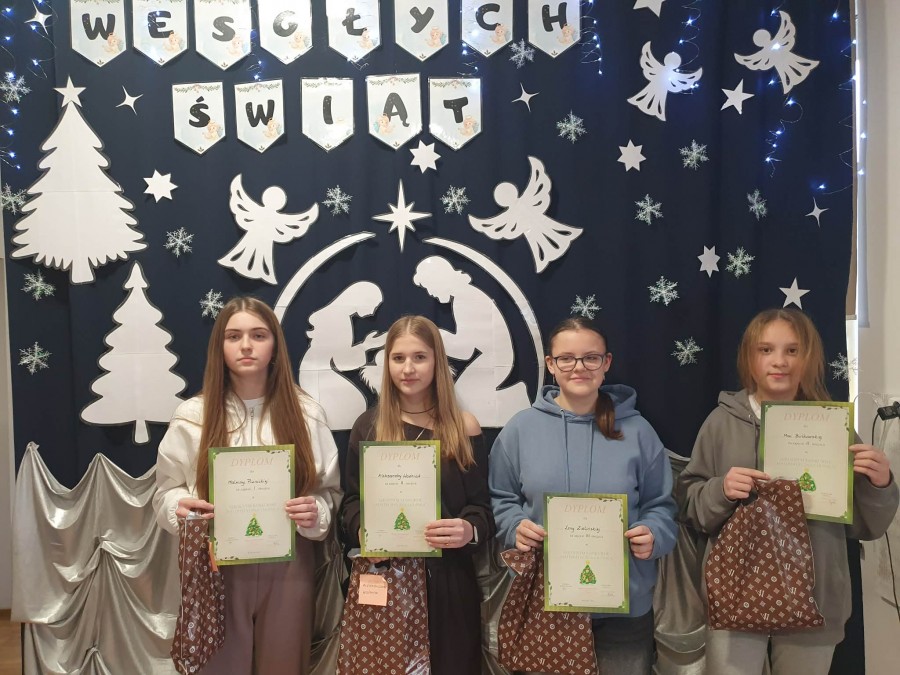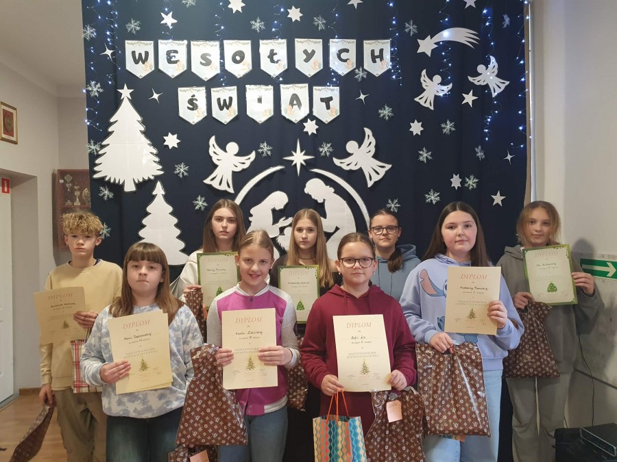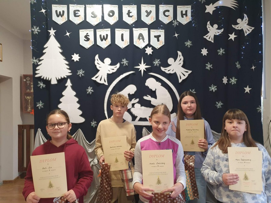 udział uczniowie z klas IV-VIII, którzy mieli wykonać pracę przedstawiającą choinkę ozdobioną elementami matematycznymi.