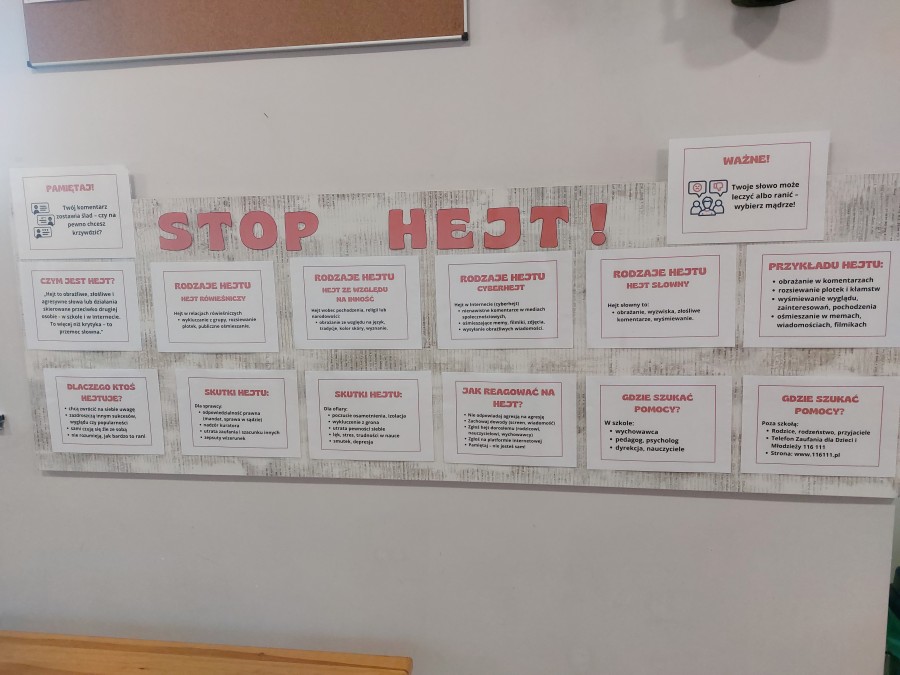 Tydzień od 29 września do 3 października 2025r. poświęciliśmy na realizowanie zadań wyznaczonych przez Ministerstwo Edukacji Narodowej. W ramach Tygodnia przeciwdziałania przemocy rówieśniczej uczniowie naszej szkoły uczestniczyli w godzinach wychowawczych, których głównym tematem była agresja zarówno słowna jak i fizyczna. Podczas zajęć poruszano problem hejtu i cyberprzemocy, aby uświadomić młodym ludziom, jakie są konsekwencje nieodpowiedzialnych zachowań w sieci.