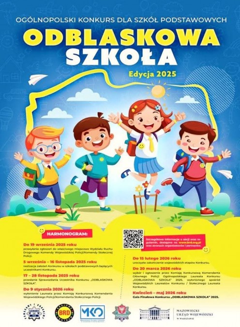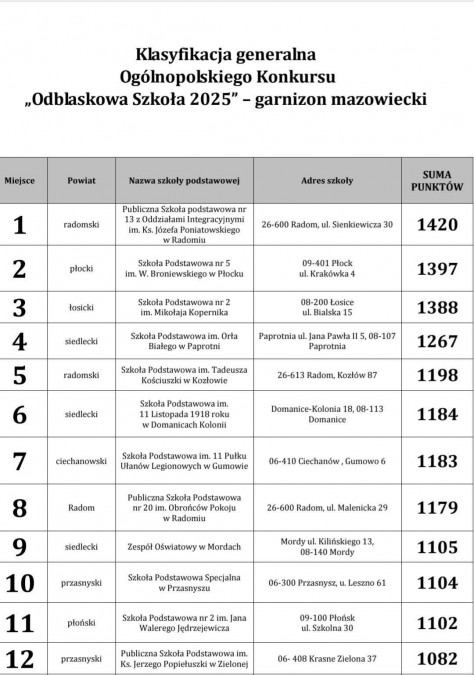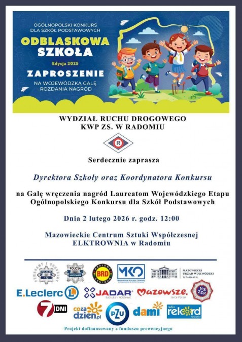 5. miejsce (na 55 szkół podstawowych) w Ogólnopolskim Konkursie "Odblaskowa Szkoła 2025" zorganizowanym przez Wydział Ruchu Drogowego KWP w Radomiu (garnizon mazowiecki). Działania służyły podniesieniu poziomu bezpieczeństwa wśród dzieci, młodzieży i seniorów. W naszej szkole odbyło się wiele wydarzeń związanych z realizacją zadań konkursowych, m.in. przygotowaliśmy filmik, przeprowadziliśmy akcję wręczania odblasków seniorom, zorganizowaliśmy Tydzień Bezpieczeństwa. Cieszymy się, że nasze pomysły na rzecz poprawy bezpieczeństwa na drogach zostały zauważone i docenione.